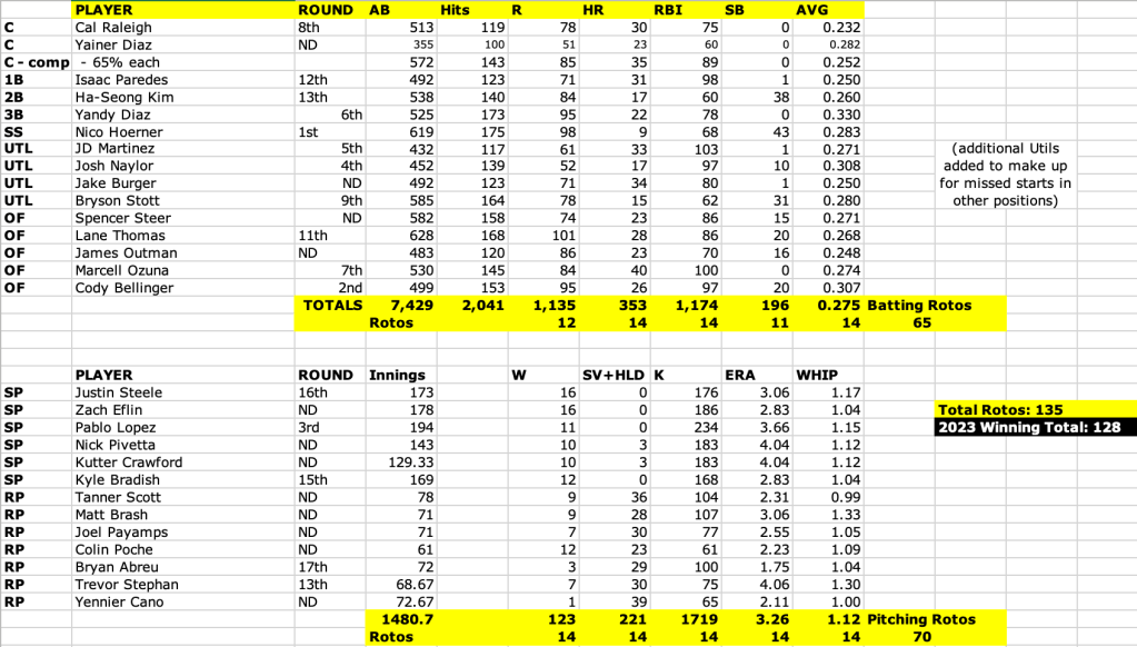 They set a league record with 135 roto points (out of 140 max) and crushed everyone including last year’s winner (who won with a pathetic 128 points).