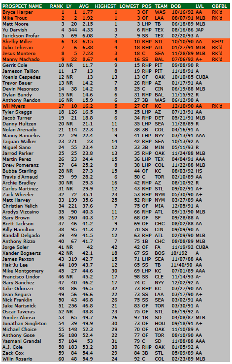 The chart at the bottom of this article shows the top 60 ranked prospects from a compilation of 19 top prospects sites.  The chart shows the prospect name, overall 2012 ranking, LY rank, average/highest/lowest ranks, position and team, date of birth and highest level played in 2011.  (NOTE: I’ve discarded the lowest score to remove outliers and then did an average)